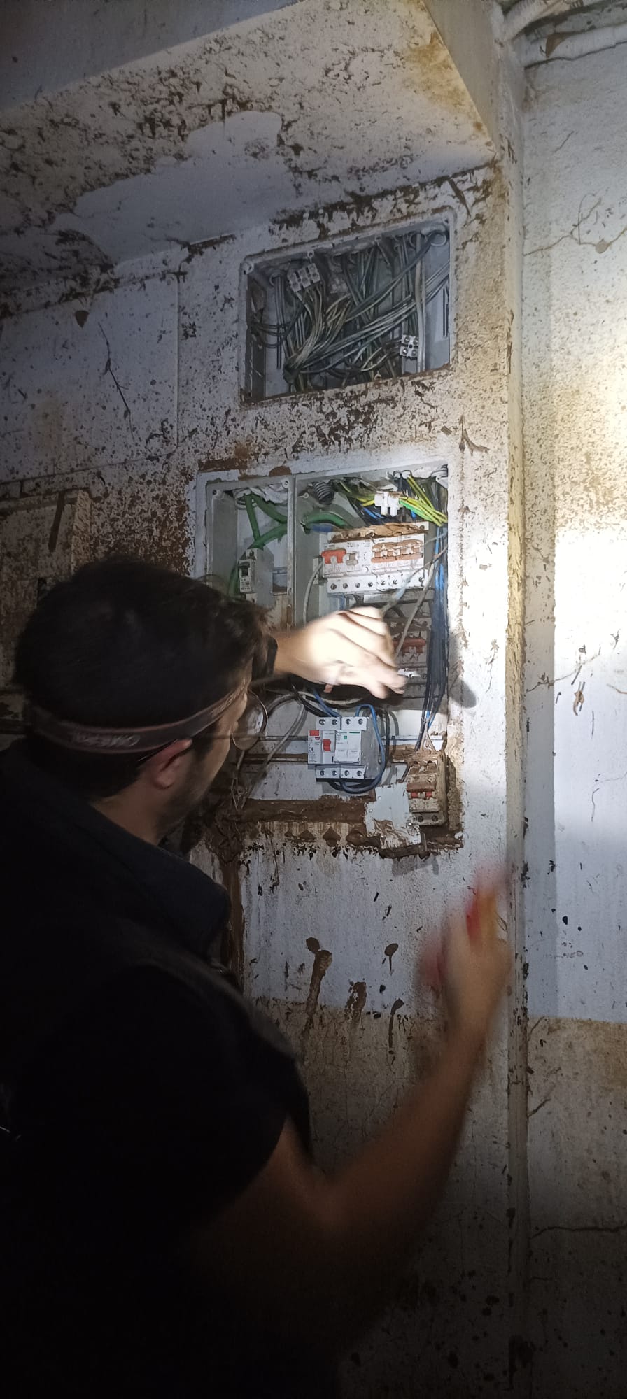 - Abre la tapa del cuadro eléctrico y mira si hay señales visibles de humedad o daño en los interruptores y el cableado (como manchas de agua, oxidación o cables quemados).